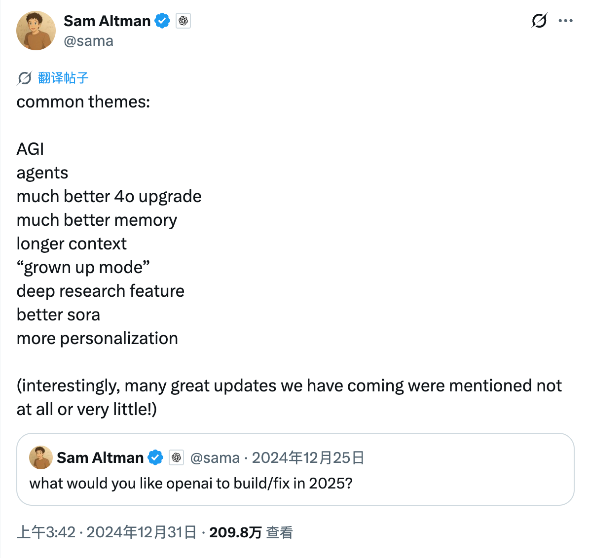 在当时 OpenAI 面向用户征集的新功能投票里,这事一度高居榜首,和 AGI、Agent、升级版 GPT-4 等一起被列入 2025 年产品计划,足见其受重视程度。