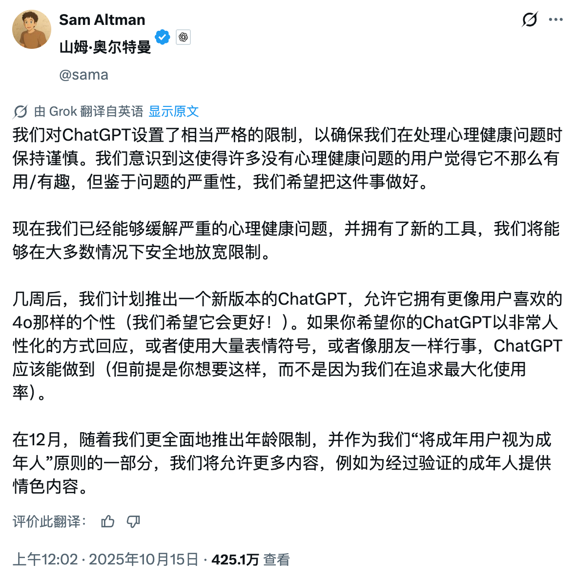奥特曼长篇大论地解释了一通,大意是说,ChatGPT 一开始设置那么多限制,主要是担心心理健康问题,怕出事,结果搞得普通用户觉得体验拉胯、不够有趣。