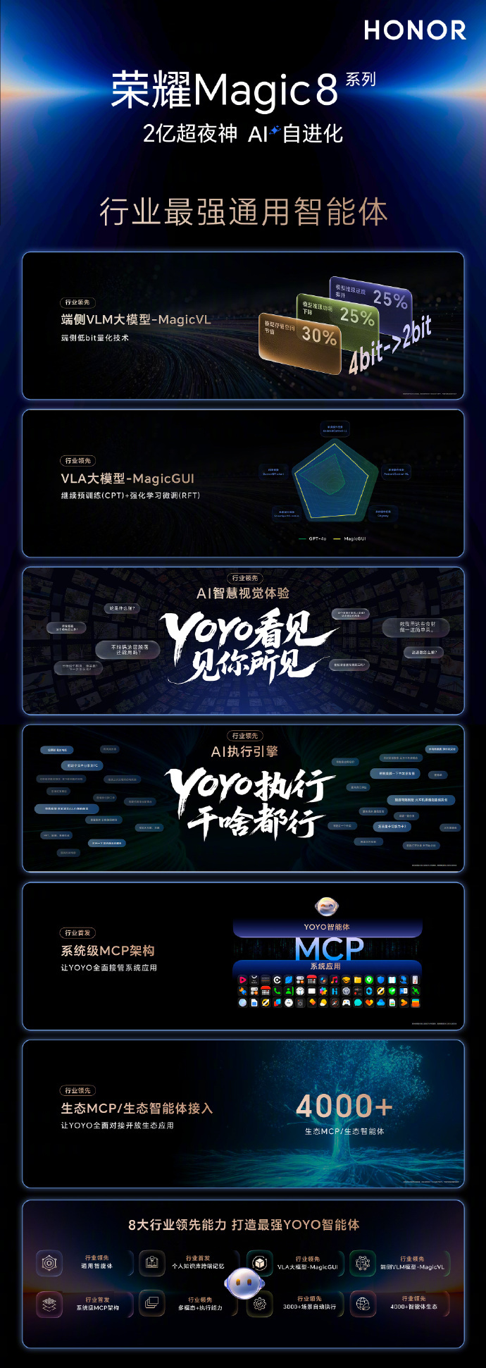 YOYO的自进化能力源自荣耀魔法大模型。荣耀魔法大模型已进化至3.0,在多模态理解、任务规划和工具调用等核心能力上持续进化,紧密协同。