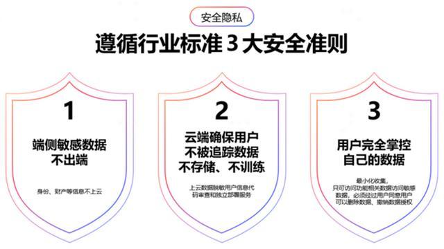 在数据安全方面,遵循行业标准,端侧敏感数据不出端,云端脱敏数据不存储、不参与算法训练,最小化申请用户数据授权,让用户完全掌控自己的数据管理,让开发者服务更值得信赖。