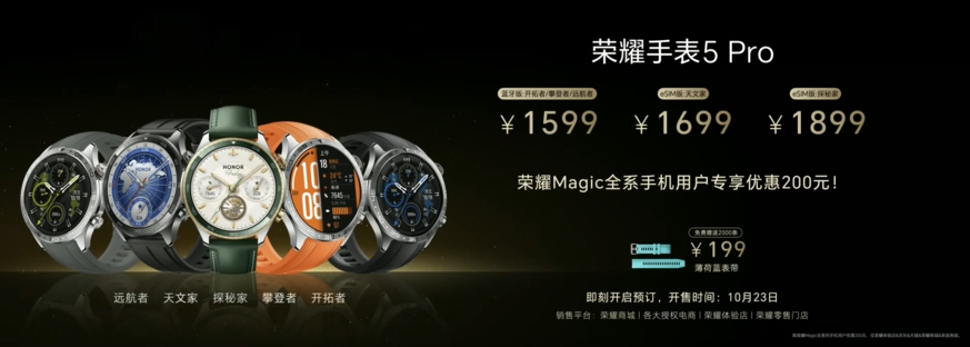 凤凰网科技讯 10月15日,荣耀Magic8系列发布会在北京水立方举办。在发布会上,荣耀手表5 Pro正式发布,售价1599元起。