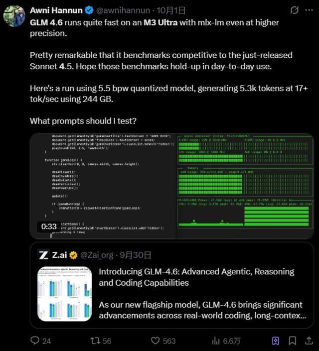 一位苹果的AI工程师Awni Hannun则分享了GLM-4.6在M3 Ultra芯片上的运行速度,该模型的量化版本能在M3 Ultra以每秒17个token以上的速度推理。Hannun还认为,GLM-4.6的基准测试结果,即便和最新发布的Claude Sonnet 4.5相比也很有竞争力。
