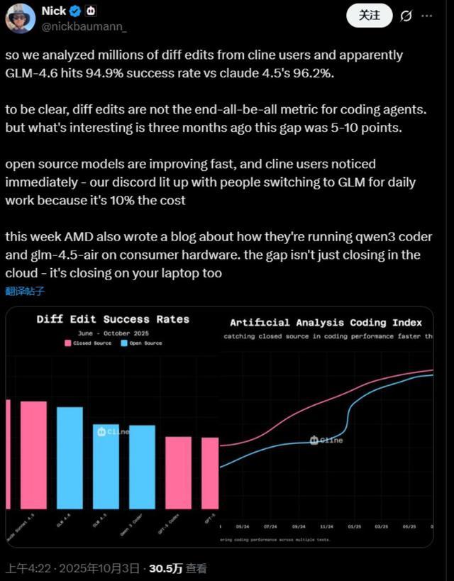 Baumann特别强调,虽然差异编辑并不是衡量编程模型能力的唯一标准,不过,在3个月前,GLM与Claude的差距还在5-10个百分点左右。