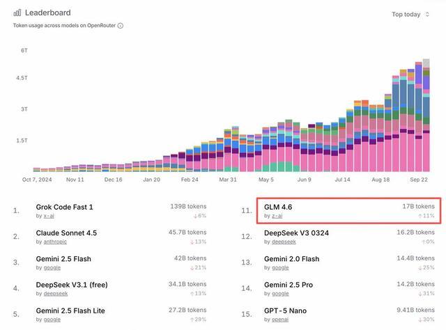 除了评测成绩亮眼,GLM-4.6的实际使用热度也在迅速攀升。根据全球多模型聚合平台OpenRouter的最新统计,GLM-4.6已成为开发者调用频率最高的模型之一。