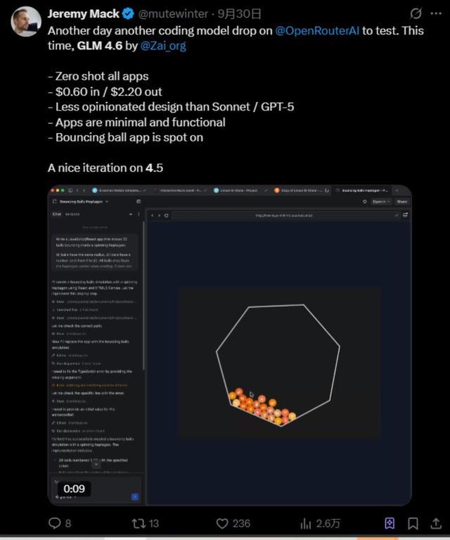 Jeremy Mack认为,GLM-4.6和Claude Sonnet、GPT-5等模型相比,在设计上不会固执己见,采取了极简主义的风格,功能完备,在经典的小球弹跳测试题上做得恰到好处。