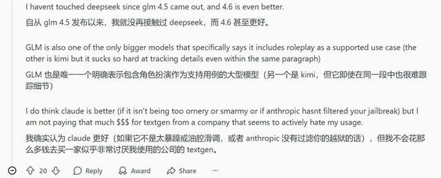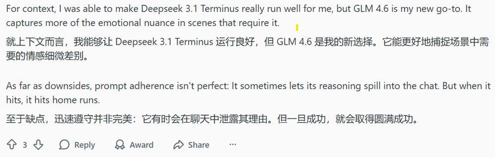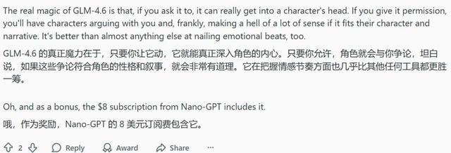 在编程之外,GLM-4.6的写作与叙事能力成为不少海外用户热议的亮点。有一群AI创意写作爱好者在Reddit上分享了他们的体验,认为GLM-4.6在角色扮演(RP)、叙事创作以及人物塑造方面表现突出。
