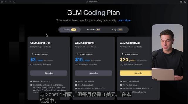 性价比是YouTube AI博主们对这款模型的另一大印象。YouTube AI博主Fabio Bergmann称,GLM Coding Plan每月3美元的起始价格,与Claude Code动辄数百美元的订阅方案相比,简直“疯狂”。他认为,市面上没有其他模型能以相同的价格提供GLM-4.6所表现出的性能。