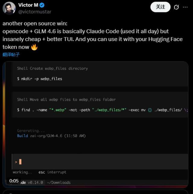 要在生产环境中发挥效用,GLM-4.6还需与现有的CLI、IDE工具实现较好的协同效应。Hugging Face产品主管Victor M分享道,他使用opencode+GLM4.6的组合编程了一整天,体验基本和Claude Code类似,但前者超级便宜。