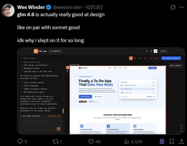 X平台上最大的Vibe Coding社区发起者Wes Winder分享,GLM-4.6在网页设计方面的表现几乎和Claude Sonnet系列模型相仿。