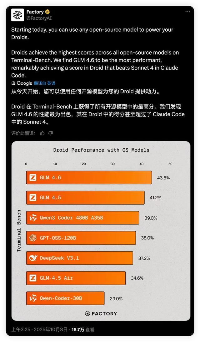 Factory作为海外领先的AI Agent与开发自动化平台,其评估结果被全球开发者广泛参考。GLM-4.6是首款在该榜单上登顶的国产开源模型,它还被正式纳入Factory的Droid生态系统,这意味着全球开发者能更“即插即用”地使用这一模型。