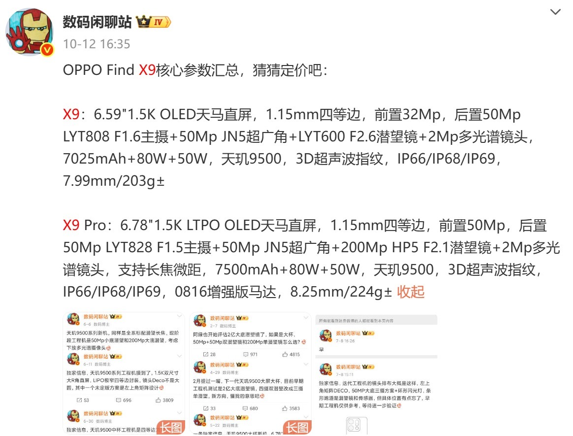 10月15日消息,据此前数码博主“数码闲聊站”爆料OPPO Find X9系列参数汇总,OPPO Find X9配备6.59英寸1.5K OLED天马直屏,1.15mm四等边设计,前置32Mp镜头,后置50Mp LYT808 F1.6主摄+50Mp JN5超广角+LYT600 F2.6潜望镜+2Mp多光谱镜头,内置7025mAh电池,支持80W有线闪充与50W无线闪充,搭载天玑9500芯片,配备3D超声波指纹和IP66/IP68/IP69防尘防水设计,机身厚度7.99mm,重量约203g。