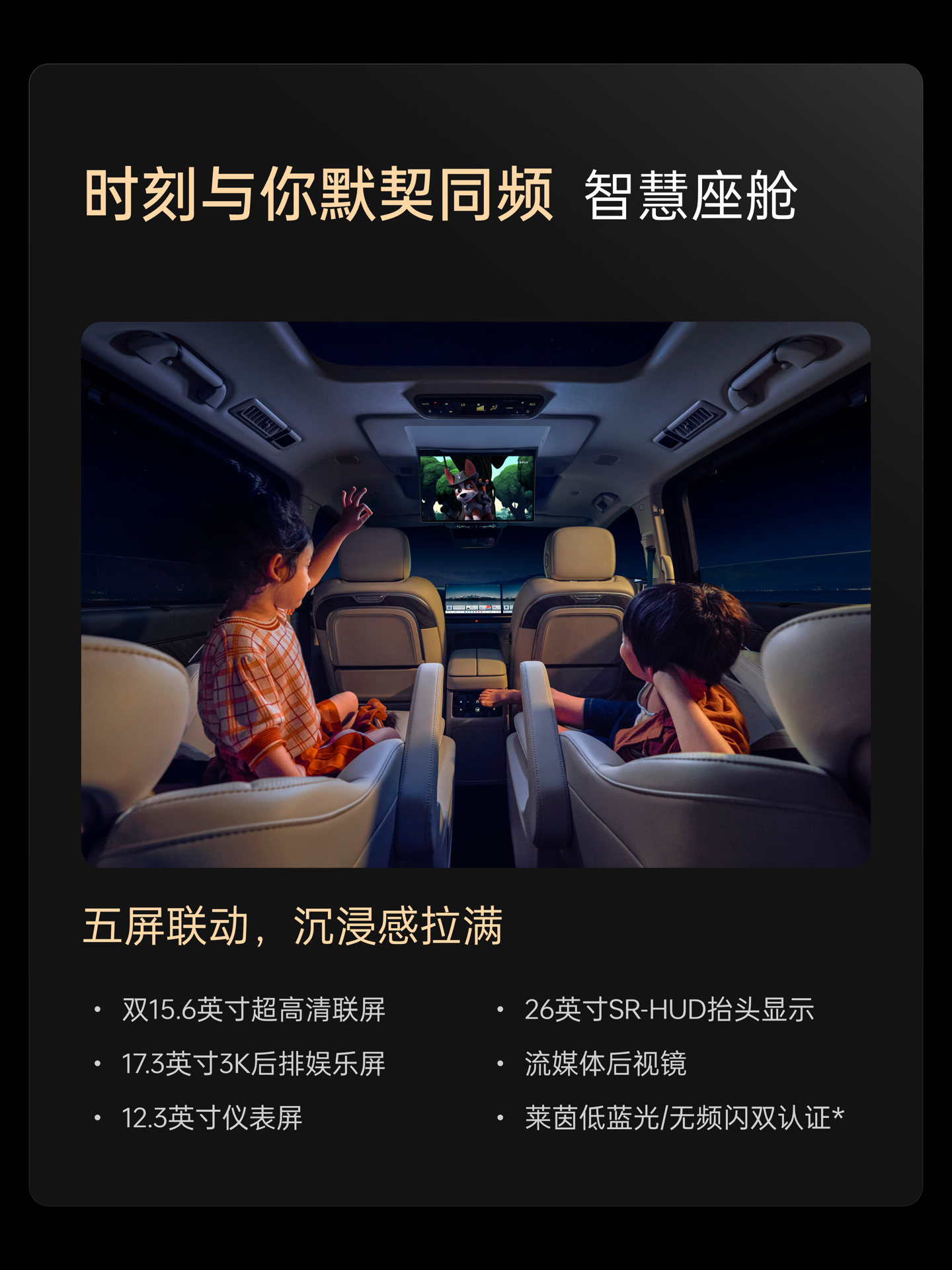 内饰方面,新车采用了家族式设计风格,配备 15.6 英寸 2.5K 双联屏、12.3 英寸仪表屏、26 英寸 SR-HUD 抬头显示,还搭载手机无线充电、电子怀挡和副驾座椅按摩等配置。