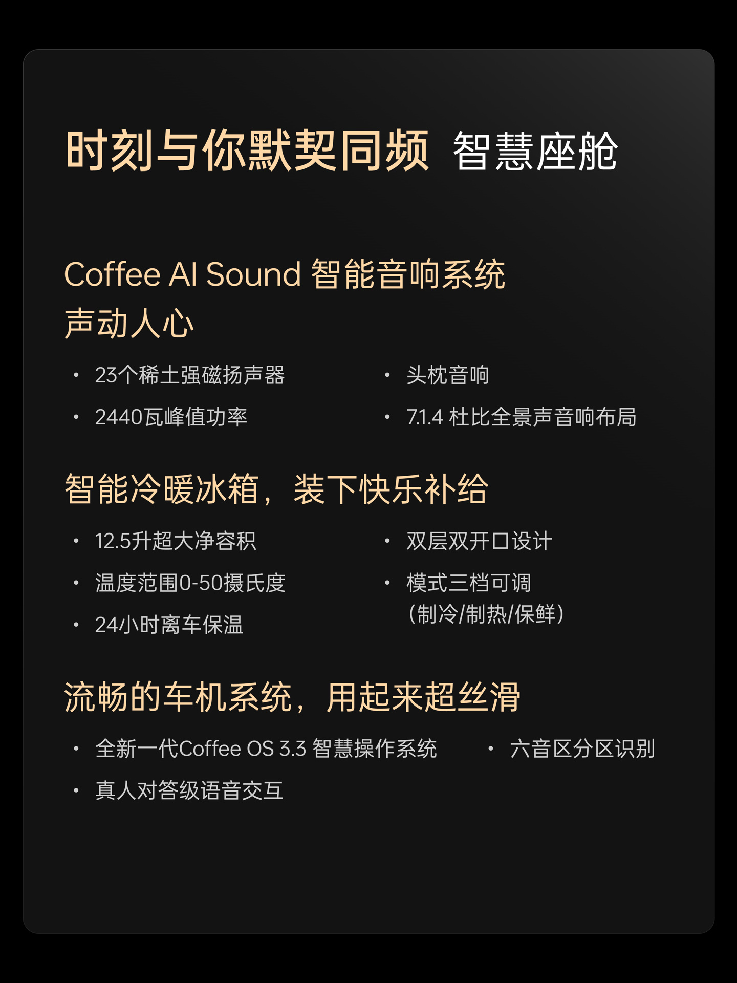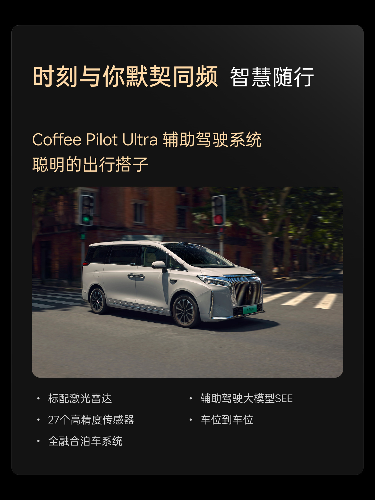 新车在车顶配备了激光雷达,将搭载 Coffee Pilot Ultra 智能辅助驾驶系统,支持高速和城市 NOA 以及智能泊车驾驶辅助功能