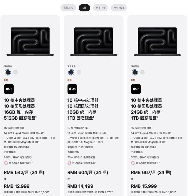新版14英寸MacBook Pro供深空黑色和银色两种配色,有16GB内存+512GB固态硬盘、16GB内存+1TB固态硬盘、24GB内存+1TB固态硬盘三种选择,分别售价12999元、14499元和15999元。