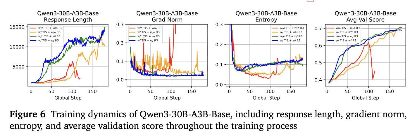 3、将R3应用于多种RL设置进行MoE强化学习,并表明R3在稳定性和整体性能方面优于GSPO和TIS。