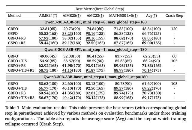 这篇论文提出了提升MoE模型强化学习训练的新方法Rollout Routing Replay(R3)。实验结果证明,R3的整体性能优于GRPO、TIS这类强化学习领域提升模型性能的优化算法,且引入R3的所有组合方法全过程无崩盘,训练过程中训练-推理KL散度等始终较低,在不影响训练速度的情况下,使得极端token比例减少一个量级。