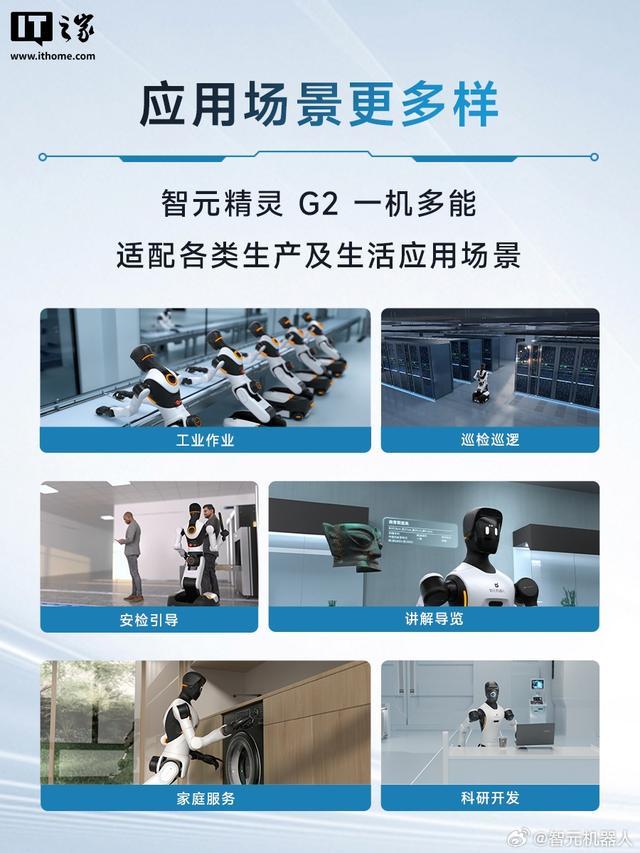 智元精灵 G2 的多功能性使其能够适配各类生产及生活应用场景,包括工业作业、巡检巡逻、安检引导、讲解导览、家庭服务还是科研开发