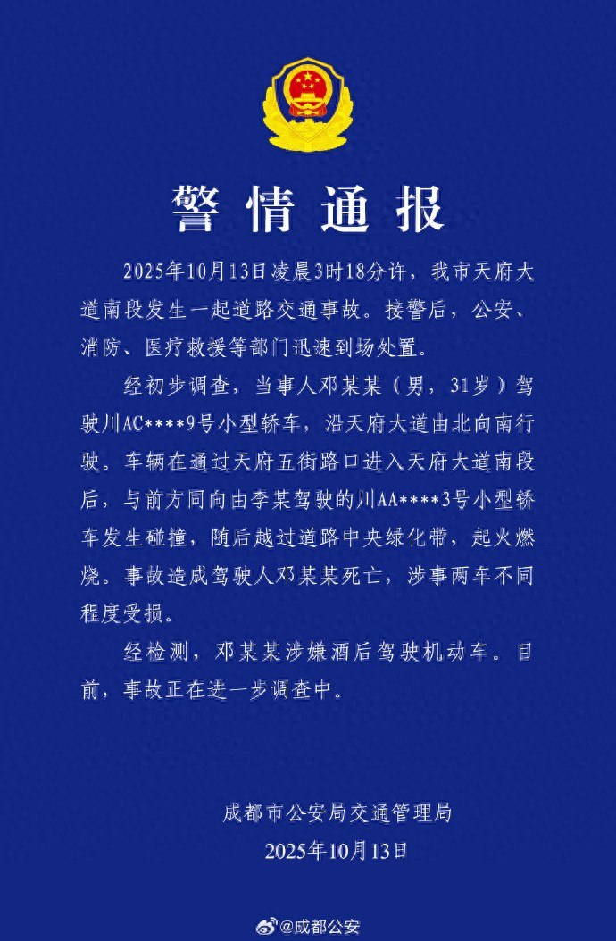 13日下午,成都市公安局官方微博发布相关警情通报称,10月13日凌晨3时18分许,一辆车牌号为川AC****9的小型轿车沿天府大道由北向南行驶时,与前方同向车辆发生碰撞后越过中央绿化带,起火燃烧,造成驾驶人邓某某(男,31岁)死亡。经检测,邓某某涉嫌酒后驾驶机动车。目前,事故正在进一步调调查中。