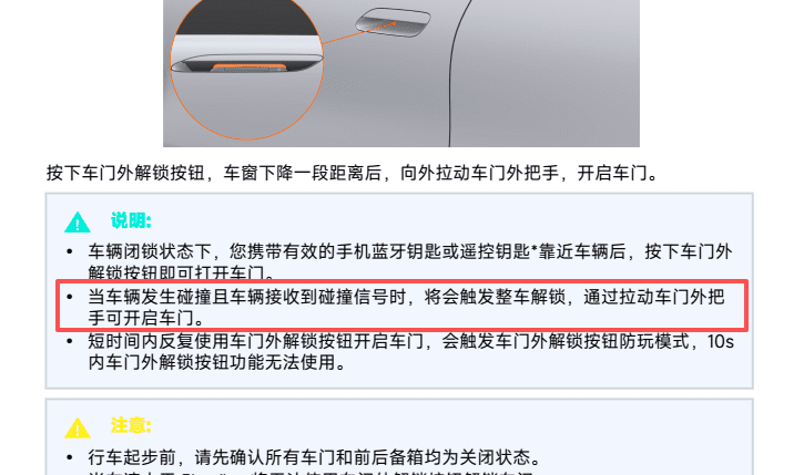 在小米SU7的说明书中,明确表示:“当车辆发生碰撞且车辆接受到碰撞信号后时,将会触发整车解锁,通过拉动车门把手可开启车门。”然而,在成都事故的现场视频中,救援的路人却始终无法打开车门。