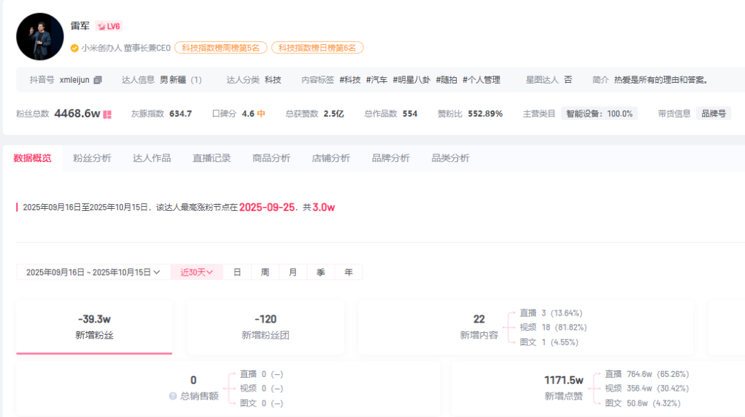 此外,灰豚数据显示,在9月16日至10月15日的30天内,小米创始人雷军的个人账号粉丝净增为负数,掉粉39.3万。
