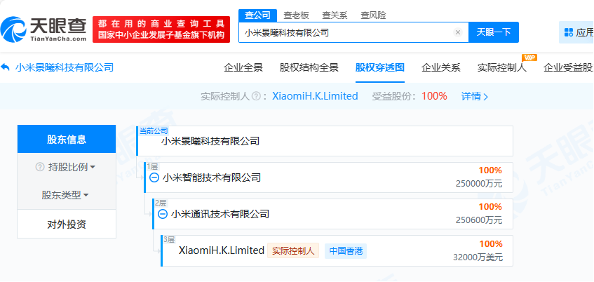 天眼查显示,景曦科技实际控制人是成立于2010年的Xiaomi H.K. Limited,属于小米集团成员。