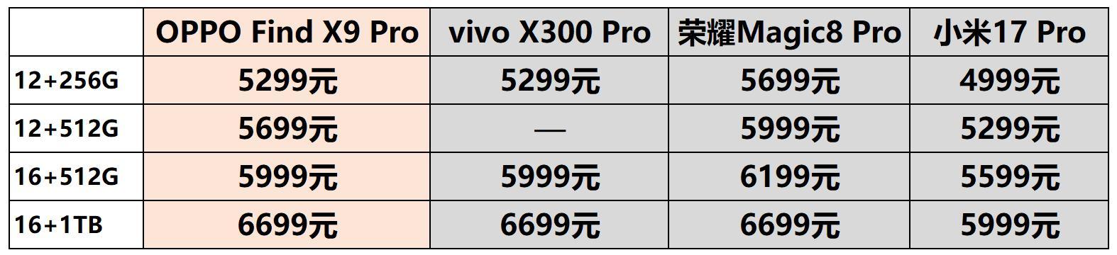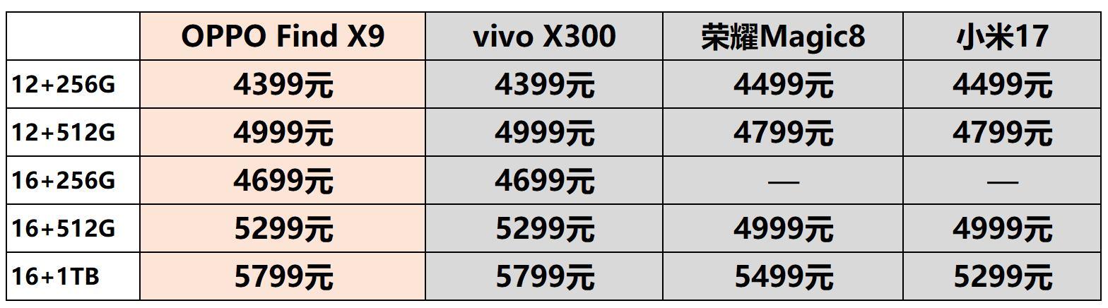 尽管起售价比小米17和荣耀Magic8略低,但其他高阶版本的价格,OPPO Find X9都要略高一些,1TB版本的价格要比小米17高出500元。