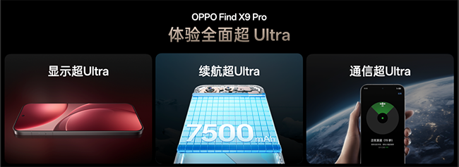 OPPO Find X9 系列全系搭载最强天玑旗舰芯片天玑 9500 ,配合新一代 OPPO 潮汐引擎,首发芯片级动态追帧与可编程调度器,大型游戏可 5 小时满帧运行。OPPO 芯链技术更打破芯片与器件壁垒,让 3nm 旗舰算力赋能影像、屏幕、触控等全场景体验升级。Find X9 系列全系标配大容量冰川电池,Find X9 为 7025 mAh,Find X9 Pro 更提升至 7500 mAh。而能实现电池容量的大幅提升,关键在于采用 OPPO 自研的完美球形硅碳材料与长寿算法,支持 60 个月健康耐用。Find X9 系列全系标配自研山海通信增强芯片,实时优化网络,确保旅行中的稳定连接。