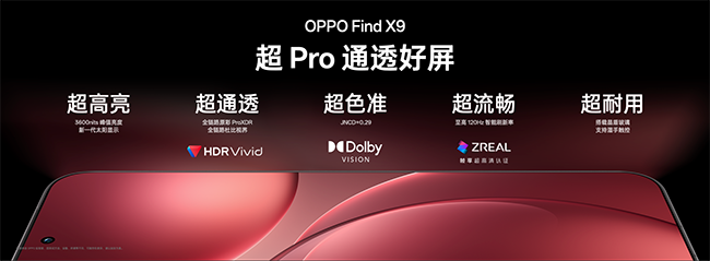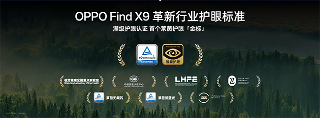 暗光也护眼,全天都通透。OPPO Find X9 的这块护眼好屏的显示素质同样出色:3600nit 超高亮度配合太阳显示技术,确保画面清晰可见;全链路原彩 ProXDR 和杜比视界,带来鲜活生动的色彩表现;120Hz 高刷并覆盖晶盾玻璃,同时支持湿手触控,兼顾流畅触感与耐用性。OPPO Find X9系列的 1nit 明眸护眼屏,以顶级显示素质、满级护眼表现,斩获包括首个莱茵护眼金标在内的 8 大权威认证。