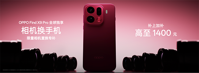同时,OPPO 还推出“相机置换专补”计划,用户可以参与活动将自己手里的相机置换为 Find X9 Pro ,可享受官方至高 1400 元补贴。