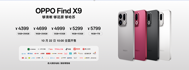作为 OPPO 30 周年巨献之作,Find X9 系列以画质革命彻底重构影像体验,用全面进化的性能、续航、护眼好屏与更流畅更智慧的系统,精准解决用户核心痛点,强势打造新一代旅拍神器。Find X9 系列 4399 元起售,10 月 22 日正式开售;Find X9 Pro 卫星通信版 11 月开售,并将率先支持 eSIM。OPPO与哈苏联合打造的哈苏专业影像套装售价 1699 元。