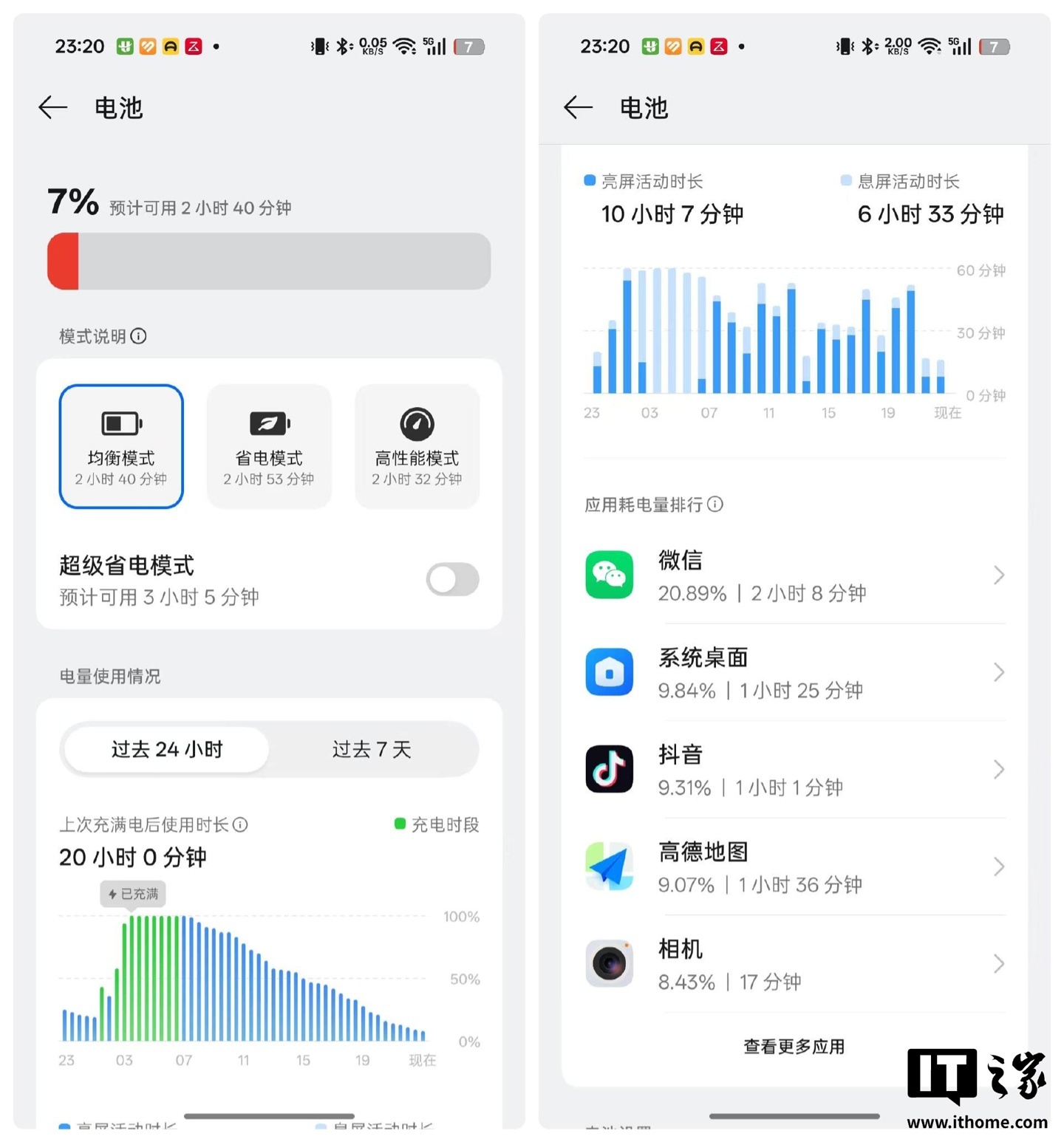 如上图所示,亮屏活动时长超过 10 小时,此时仍有 7% 的剩余电量