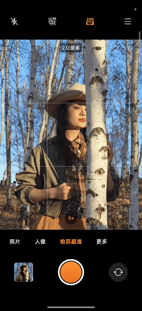 在拍照界面,选择哈苏超清,点击右上角的 200MP 图标,即可拍摄 2 亿像素,系统默认输出的是 5000 万像素。