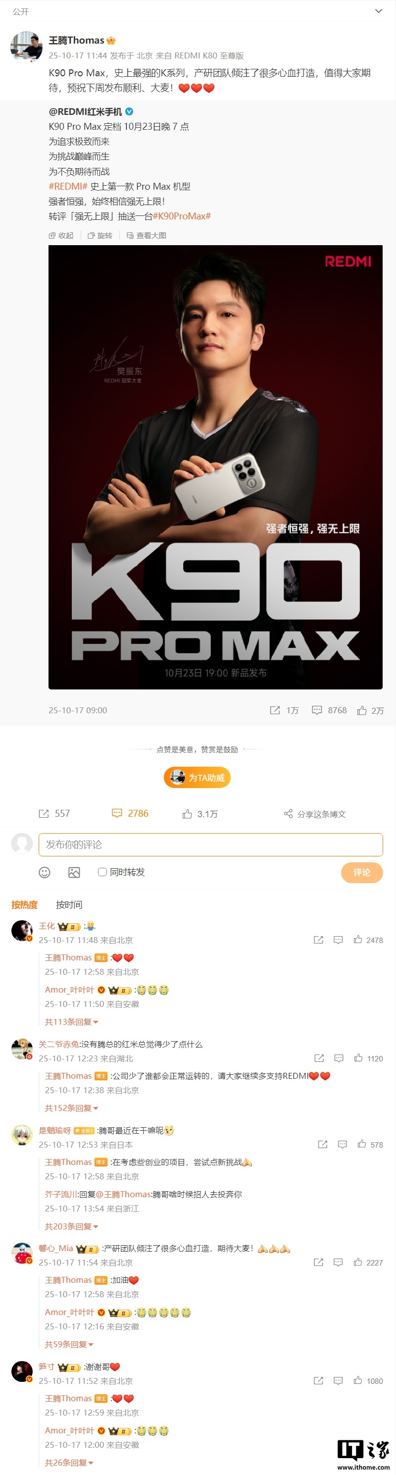 原小米中国区市场部总经理、REDMI 品牌总经理王腾随后发文称:K90 Pro Max,史上最强的 K 系列,产研团队倾注了很多心血打造,值得大家期待,预祝下周发布顺利、大麦!