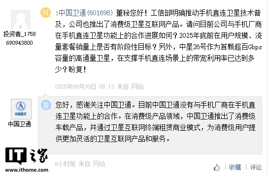 IT之家 10 月 17 日消息,中国卫通今日在投资者互动平台透露,目前中国卫通没有与手机厂商在手机直连卫星功能上的合作。在消费级产品领域,中国卫通推出了消费级车载产品,并通过卫星互联网终端租赁商业模式,为消费级用户提供更加灵活的卫星互联网产品和服务。