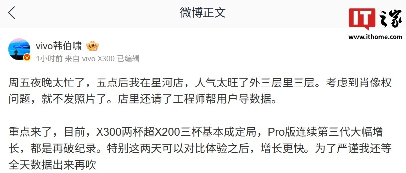 vivo 通信科技有限公司产品经理韩伯啸今日发文透露,目前 X300 两杯超 X200 三杯基本成定局,Pro 版连续第三代大幅增长,都是再破纪录。韩伯啸表示,为了严谨等全天数据出来再吹。