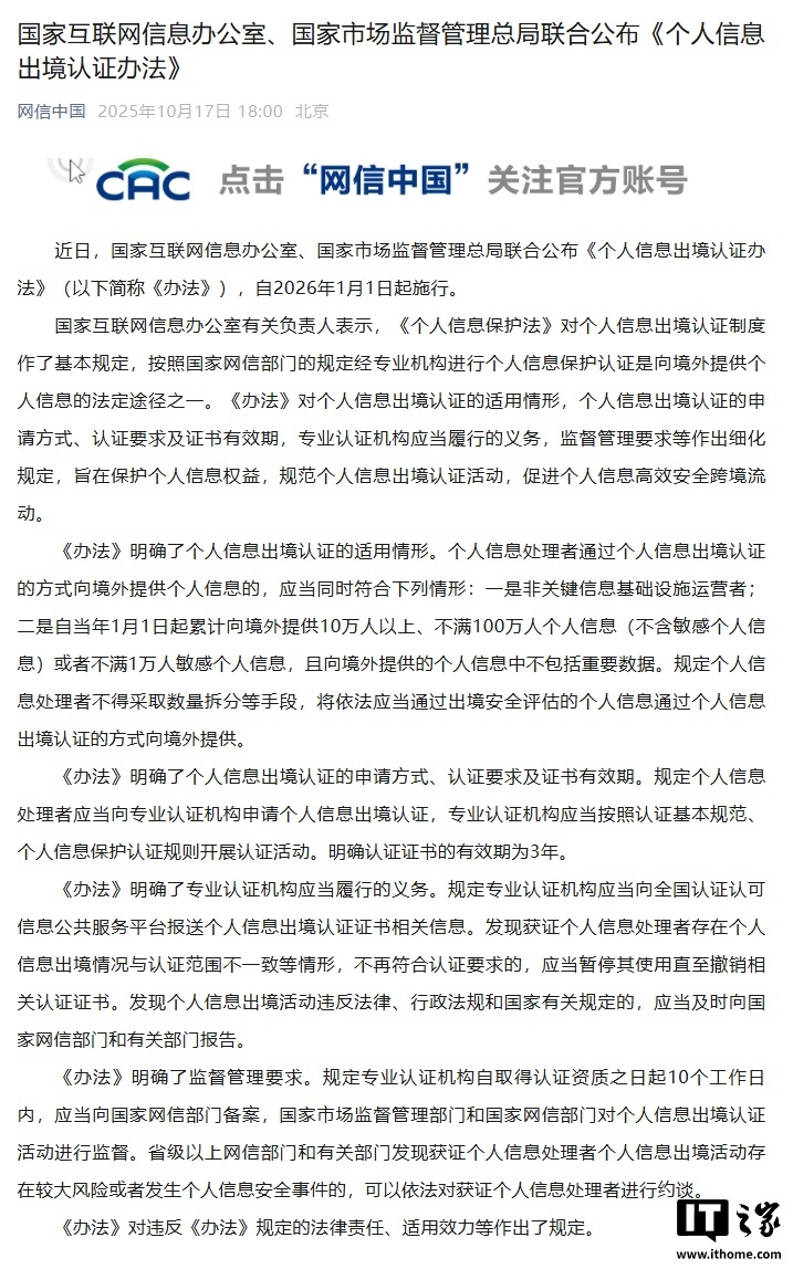 IT之家 10 月 17 日消息,近日,国家互联网信息办公室、国家市场监督管理总局联合公布《个人信息出境认证办法》(IT之家注:以下简称《办法》),自 2026 年 1 月 1 日起施行。