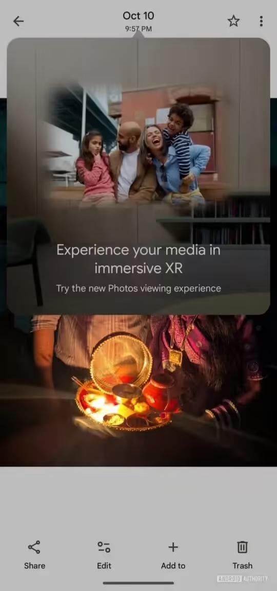 同时谷歌还为普通照片增添了“沉浸式模式”功能,只要浏览普通照片就会弹出相关提示,不过只要点击就会立即崩溃,因此目前我们还无法知道这个按钮的作用,不过它有可能只是将照片投射到头显上;也可能是可以将普通照片转化为空间照片。