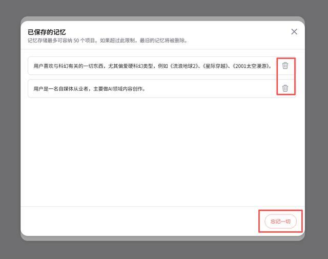 显式记忆,点“管理”可以进行增删,或者“忘掉一切”。
