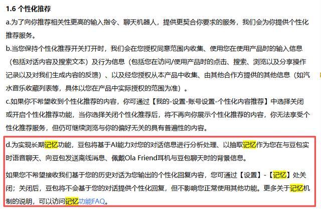 豆包更新了隐私协议,提到记忆功能
