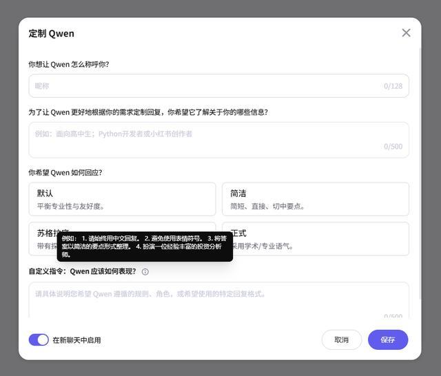 可以设计你的个性昵称,给它提供你的背景信息(与记忆功能有点类似),也可以设计Qwen的语言风格,以及自定义它的回复指令。