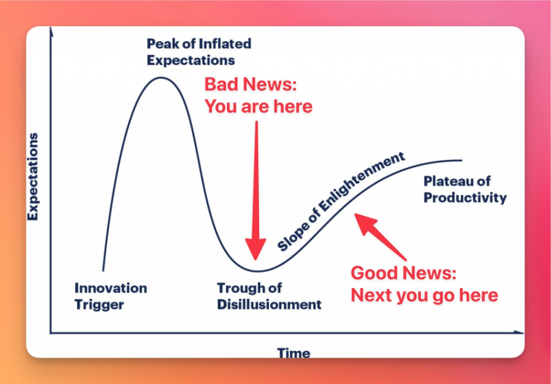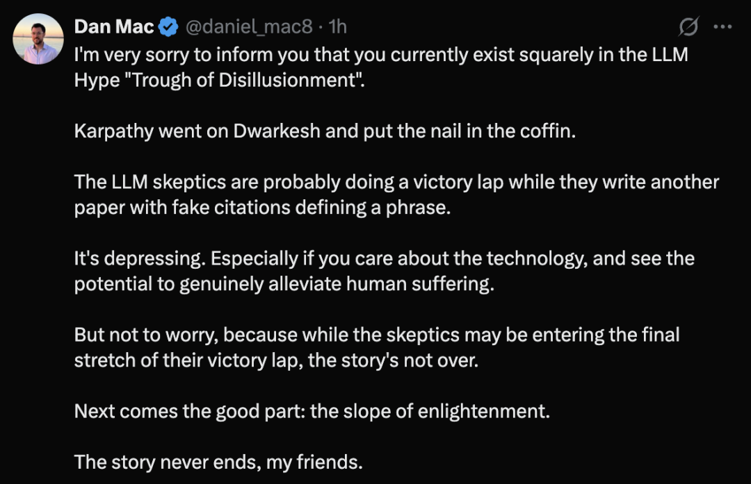 智能体工程师Dan Mac表示,Karpathy在断言,现在正处于LLM炒作的「幻灭低谷期」。