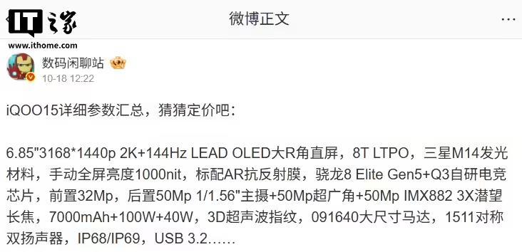 IT之家 10 月 19 日消息,iQOO 15 手机将于 10 月 20 日 19:00 发布并开售,博主 @数码闲聊站 现已曝光这款新机的主要参数。