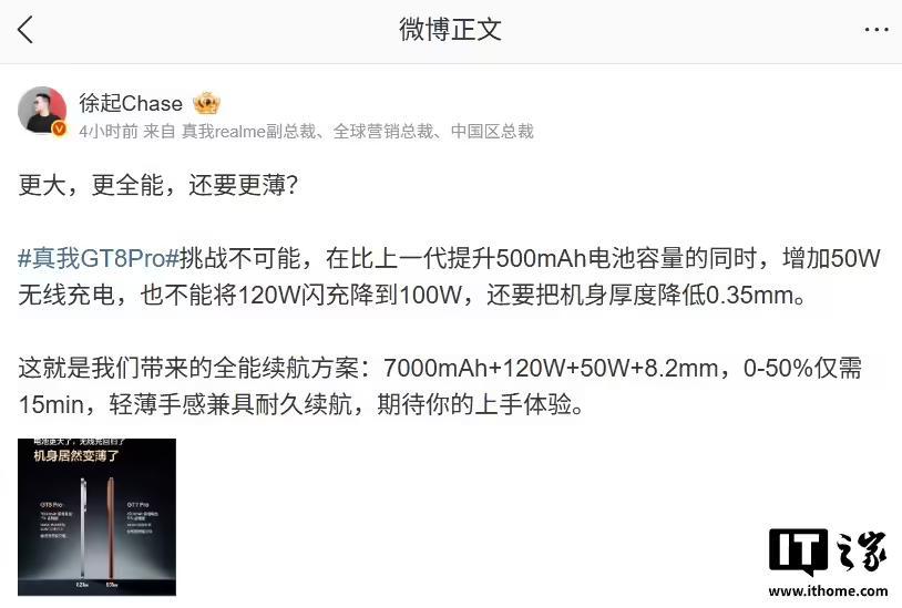 IT之家 10 月 19 日消息,realme 真我手机官方今日正持续预热 GT8 Pro 新机。据介绍,真我 GT8 Pro 比上代电量更足,内置 7000mAh 泰坦电池(提升 500mAh),在电池容量提升的基础上,该机还将其厚度减薄 0.35mm。