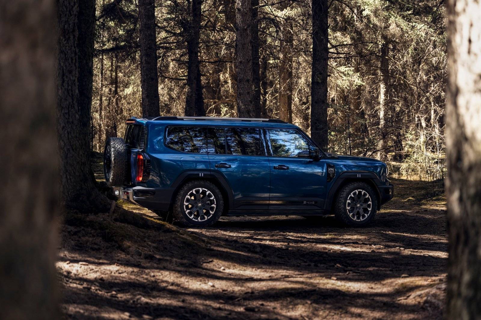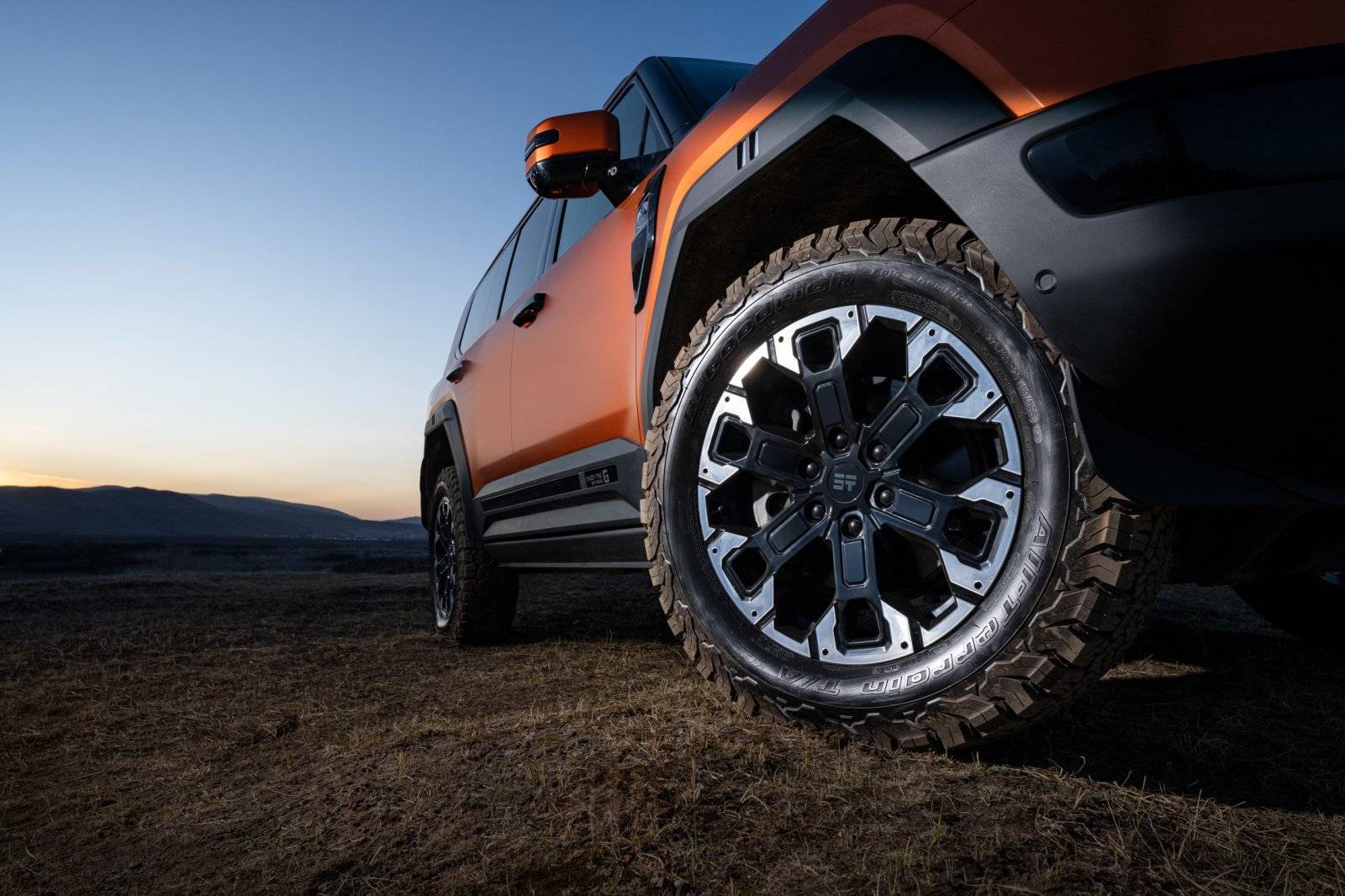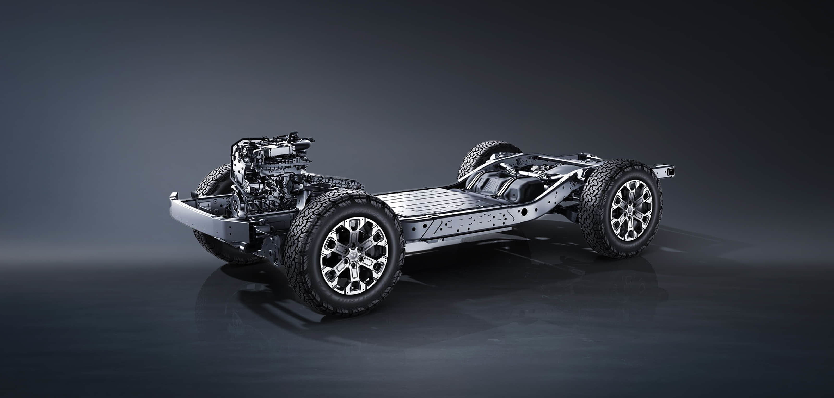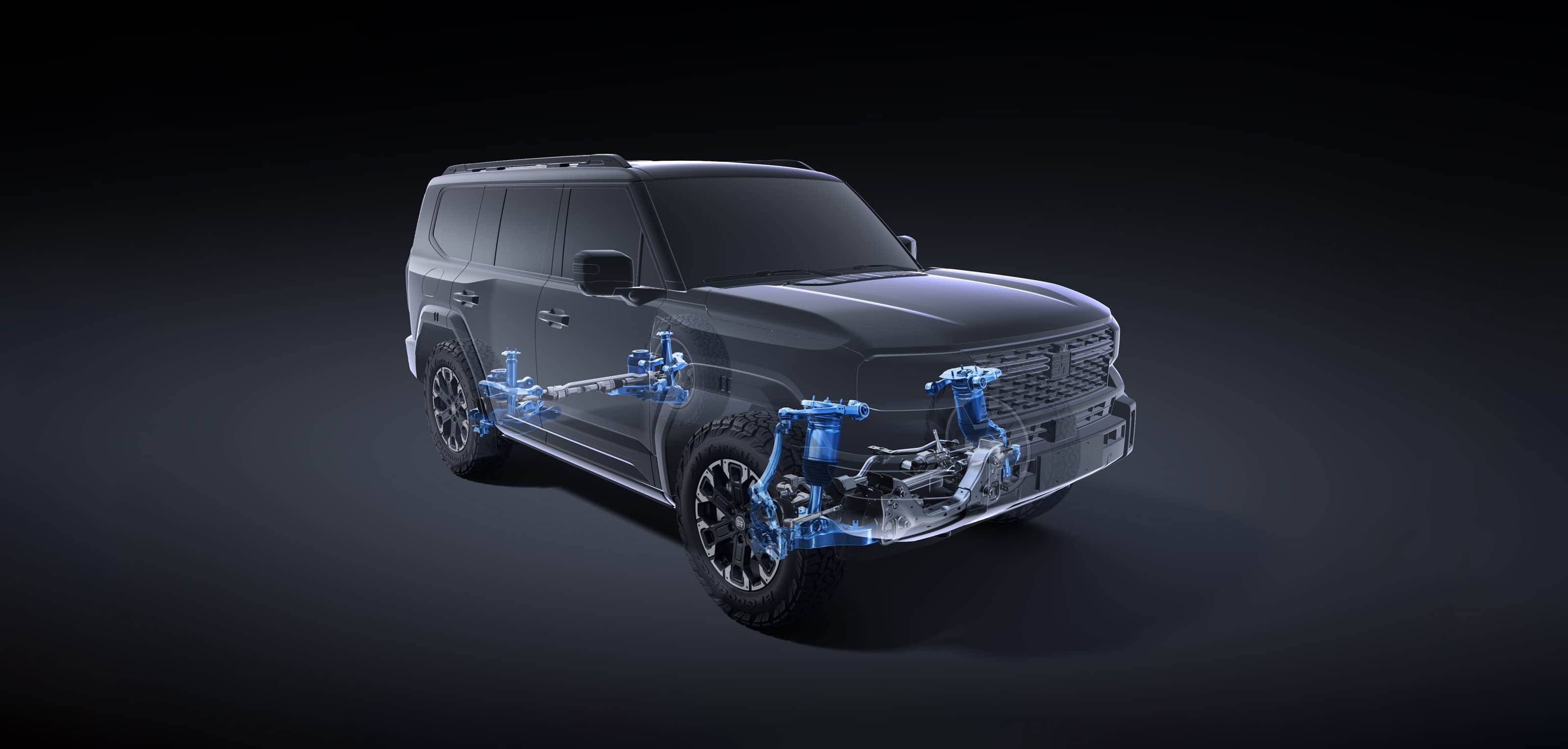 新车采用高压一体成型车架,前、中、后三段纵梁均为内高压成型,并配 7 段内高压横梁,大梁高强度钢占比 99%。当空气弹簧升至最大高度时,车辆接近角 ≥ 40.3°、离去角 ≥ 32.3°、纵向通过角 ≥ 28.2°、离地间隙 ≥ 320 mm,可以轻松应对极端越野路况。