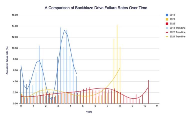 博客进一步解释道:“这意味着什么?简而言之,硬盘正在变得越来越好,也越来越耐用。鉴于 2021 年至 2025 年间趋势线形状基本一致,我们预计未来几年仍将持续这一模式。因此,等到 2029 年左右再回过头来看,很可能会发现故障峰值进一步向后推移。”