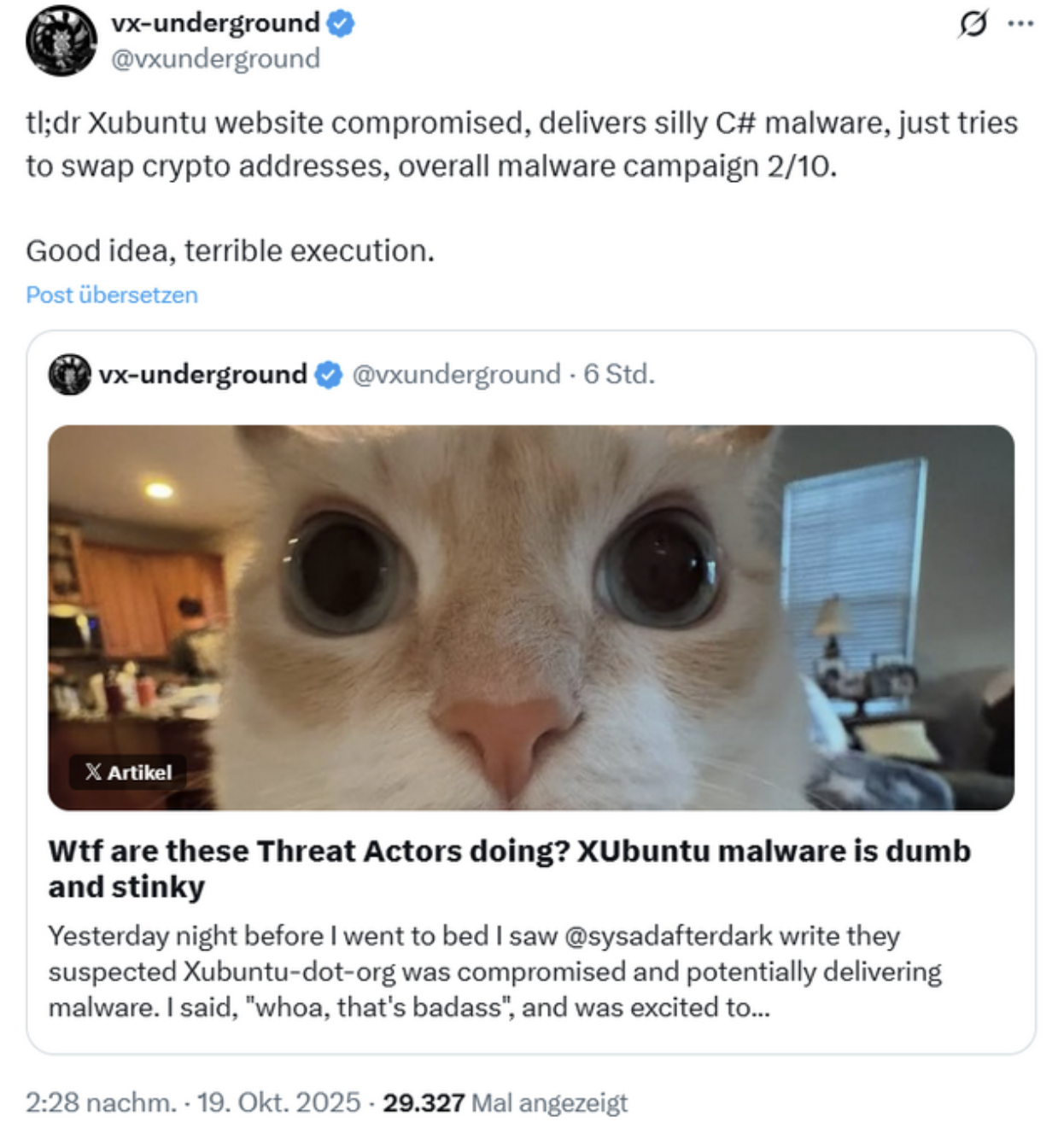 IT之家 10 月 20 日消息,博主 vx-underground 在 Reddit 和 X 平台上报告,其访问 xubuntu.org/download/ 页面下载 Xubuntu Linux 时,得到的文件包并非预期的 Linux 镜像,而是一个包含可疑 Windows 可执行文件(.exe)的 ZIP 压缩包。