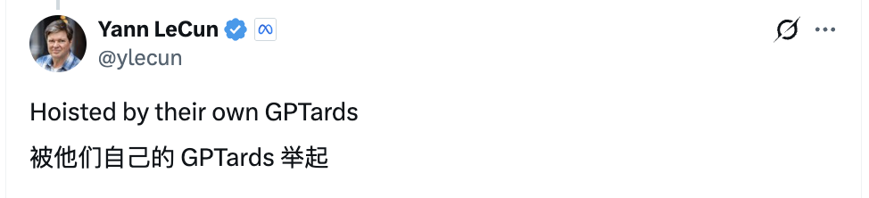 (梗注:原文为“Hoisted by their own GPTards”,源自英文俗语 “hoisted by their own petard”,意指“搬起石头砸自己的脚”,这里被LeCun改为GPTards,以讽刺那些盲目吹捧GPT的人。)