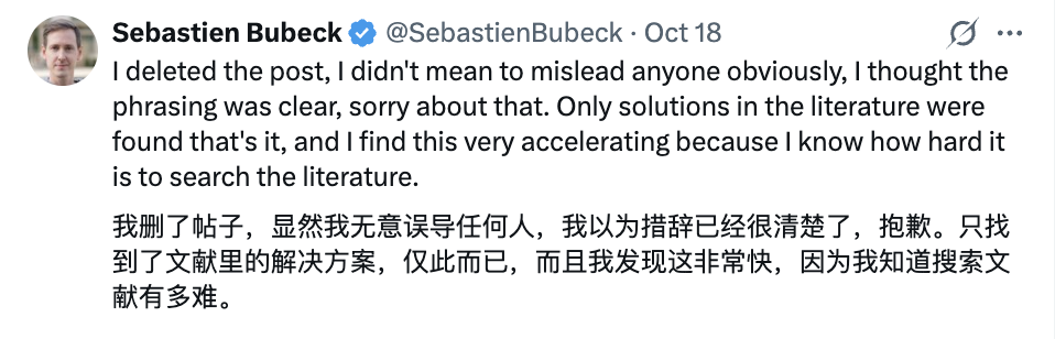 事后,Bubeck删除了之前的推文: