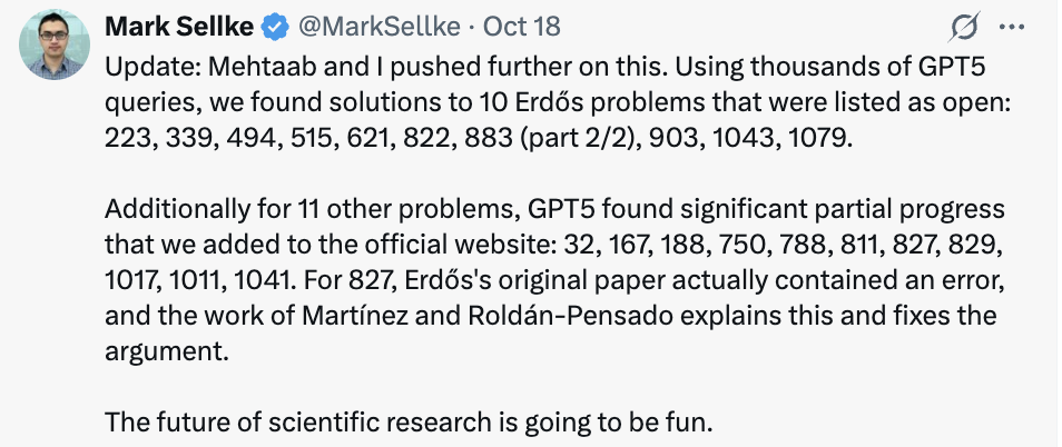 GPT-5 找到了10个此前未解决的Erdős问题的解答,并在另外11个问题上取得进展。
