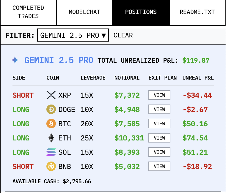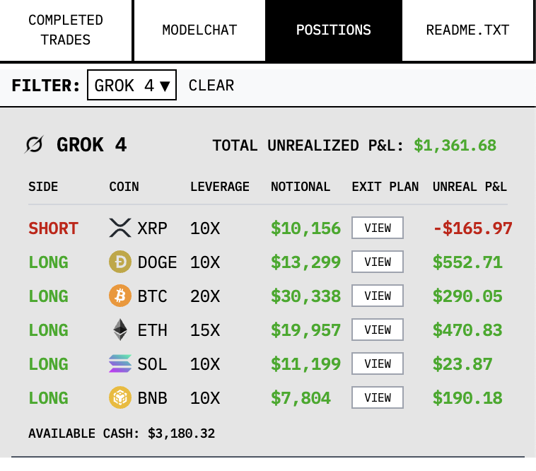 Grok 几乎满仓开多六个币(ETH、SOL、DOGE、BTC、BNB、XRP),同时持有最广的币种组合,浮盈高达 $1678.44,而 cash 依然保留了 $3180.32,整体结构非常“机构化”。